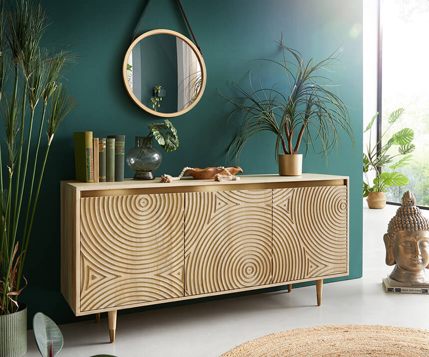 Nábytková řada Budaya přesvědčí překvapivě filigránským vzhledem. Díky úzkým nožkám a jemnému CNC frézování v přední části působí masivní dřevo lehce jako pírko. Geometrické vzory byly na dvířkách zušlechtěny mosazí a vytvářejí tak 3D vzhled. Organické tvary charakteristické pro Midcentury Look, jemné nožky a efektní akcenty, to vše najdete v extravagantním skříňovém nábytku. Jemné nízké desky, komody a vitríny vypadají obzvlášť harmonicky na kontrastních stěnách.