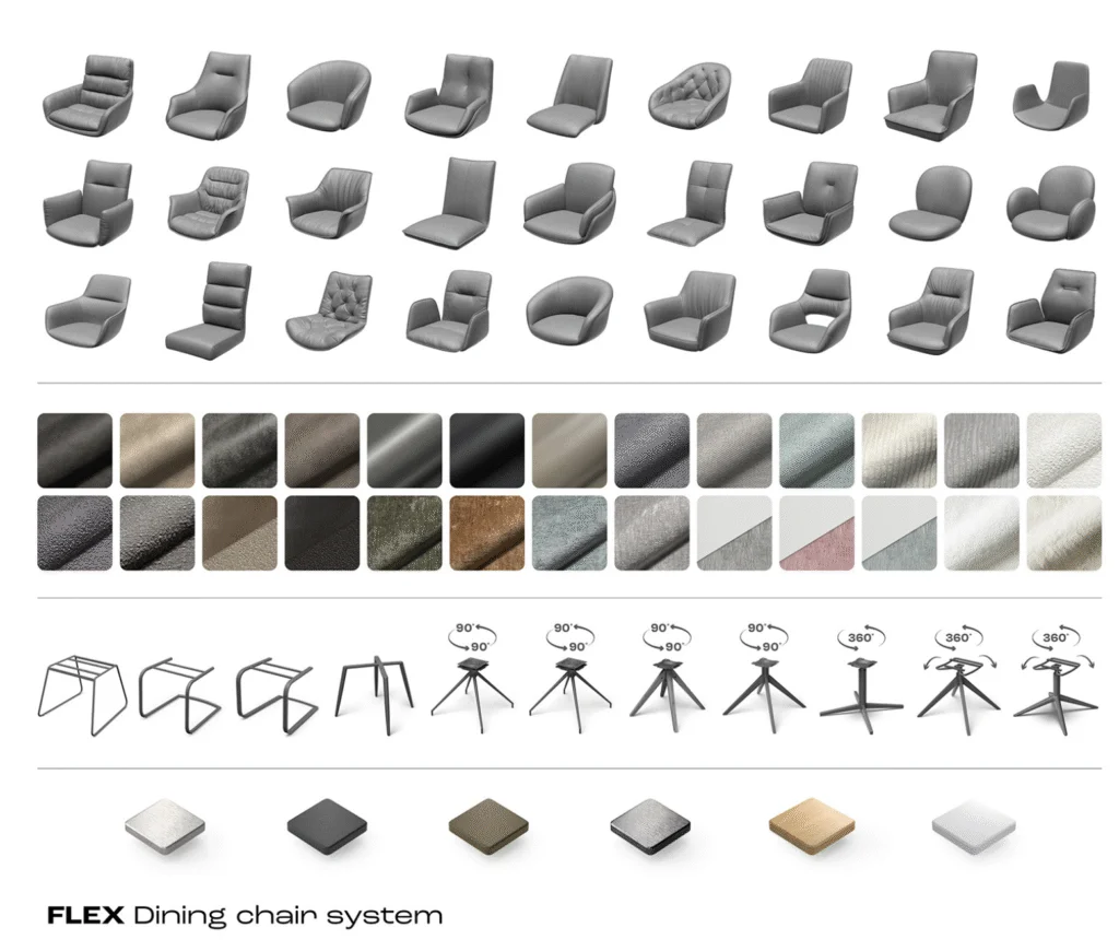 Pamatujete, jak jsme si jako malí skládali kostky a bavilo nás vymýšlet, jak to bude vypadat? Dobrá zpráva. Dospělá verze téhle radosti existuje. Říká se jí FLEX a je to židle, kterou si poskládáte přesně podle svého života. Dřevěná nebo kovová podnož. Otočná nebo pevná. Žinyl, mikrovlákno nebo kůže. Béžová do skandi bytu nebo výrazná barva pro odvážné hostitele. Vaše pravidla, vaše židle.