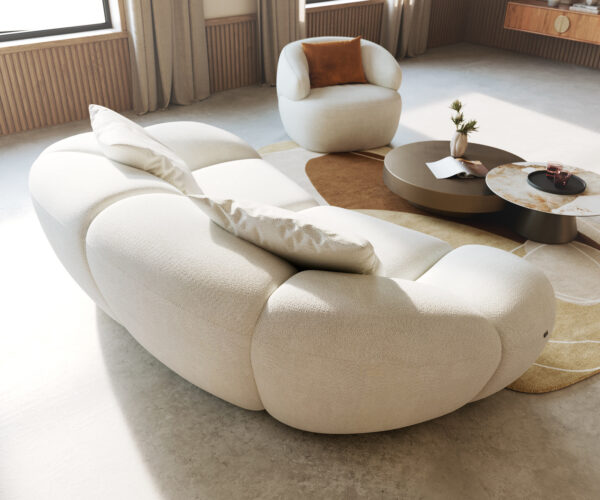 Pohovka Lunna spojuje moderní design s obzvlášť vysokým komfortem sezení. Jemně zaoblený tvar a kvalitní čalounění zajišťují příjemnou atmosféru a dělají z pohovky stylové centrum vašeho obývacího prostoru. Béžový potah Bouclé Soft zaujme svou jemně strukturovanou povrchovou úpravou a podtrhuje elegantní a útulný vzhled. Dva odpovídající polštáře jsou již součástí dodávky a zvyšují pohodlí.