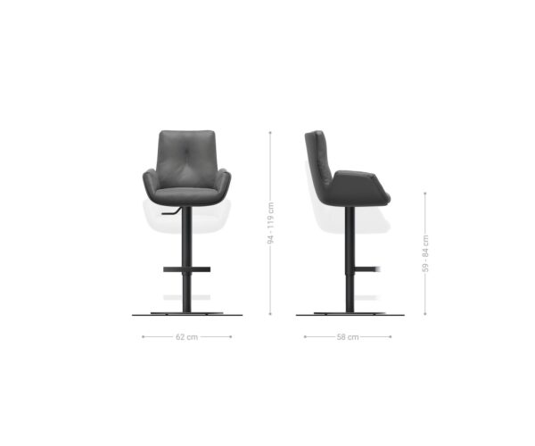 Podnož je díky široké základně zvláště stabilní a odolná proti převrácení. Výšku barové židle lze snadno přizpůsobit tvým potřebám pomocí plynové pružiny. Barová židle je otočná o 360 stupňů a navíc má praktickou opěrku na nohy, která činí sezení obzvlášť příjemným a pohodlným.