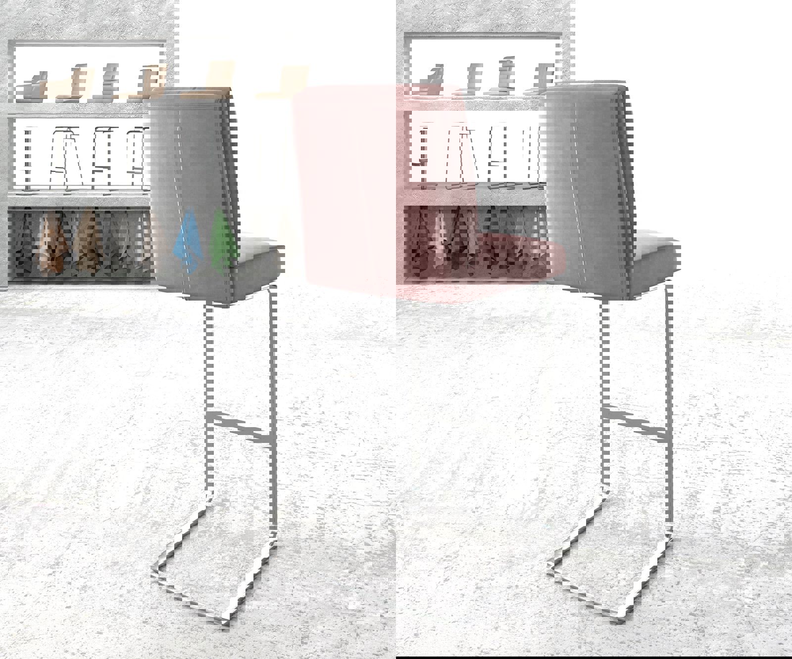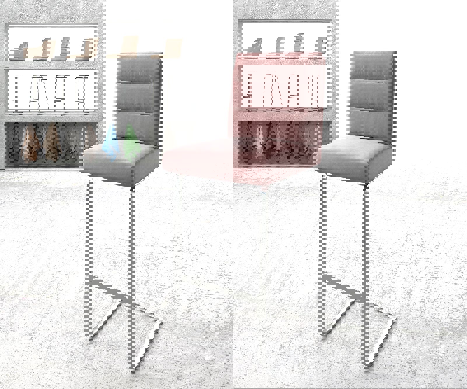Barová židle má výjimečnou podnož v elegantním tvaru závěsné jídelní židle z moderní ploché oceli. Její lehká houpací funkce činí sezení obzvlášť šetrným k páteři. Pro zvýšený komfort sezení slouží stabilní opěrka nohou.