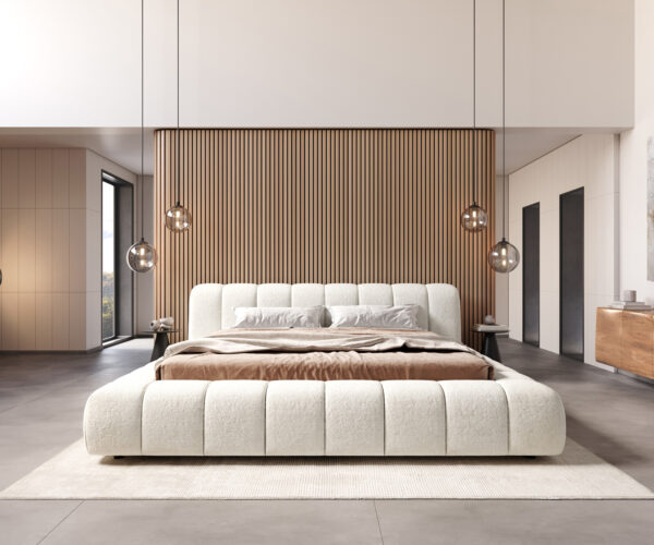 Ponořte se do světa klidu s naší čalouněnou postelí v béžové barvě z látky Bouclé Soft. Jemná struktura, měkký povrch a prostorný design zvou k odpočinku. Obdélníkové prošití doplňuje celkový vzhled o stylový detail a zdůrazňuje kvalitní zpracování.