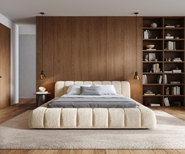 Vytvoř si své osobní místo pohody s naší čalouněnou postelí z měkké plyšové látky Teddy. Jemné béžové zbarvení a objemná konstrukce vytvářejí útulnou atmosféru, která zve k odpočinku a snění. Obdélníkové prošití zajišťuje stylový vzhled a dodává posteli harmonickou strukturu – ideální pro ložnici plnou bezpečí.