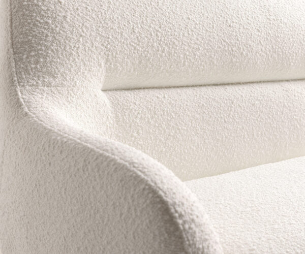 Světle krémově bílá barva a příjemně strukturovaná bouclé tkanina přinášejí do obytného prostoru lehkost a eleganci. Kvalitní zpracování a měkký dotek činí z tohoto materiálu stylovou volbu pro pohodlný každodenní nábytek.