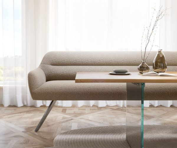 Jídelní lavice Taya-Flex 200 cm bouclé tmavě béžová křížová podnož hranatá nerezová ocel taštičkové pružiny