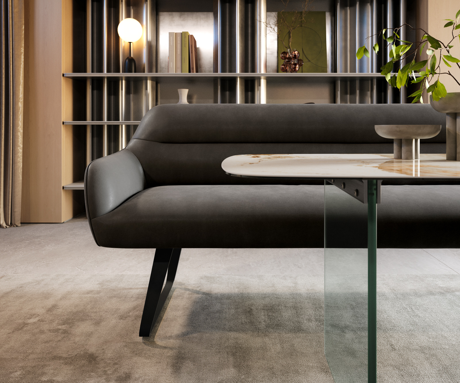Plochá tenká podnož dodává jídelní lavici moderní a lehký vzhled. Šikmé, decentně zaoblené linie vytvářejí elegantní a otevřenou siluetu. Díky souvislému tvaru vzniká harmonická rovnováha mezi stabilitou a designem.