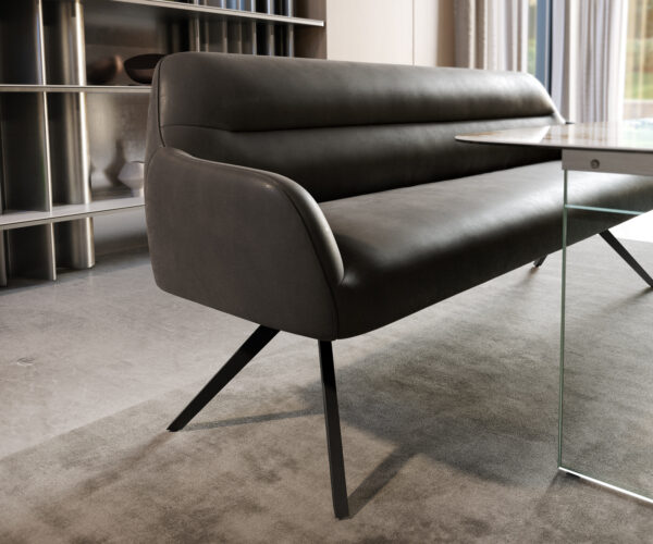 Podnož v černé barvě získává díky práškovému nátěru rovnoměrný matný povrch. Ten je zvláště odolný proti poškrábání a snadno se čistí. Tmavý odstín dodává lavici výrazné a moderní charisma – ideální pro elegantní jídelní prostory.