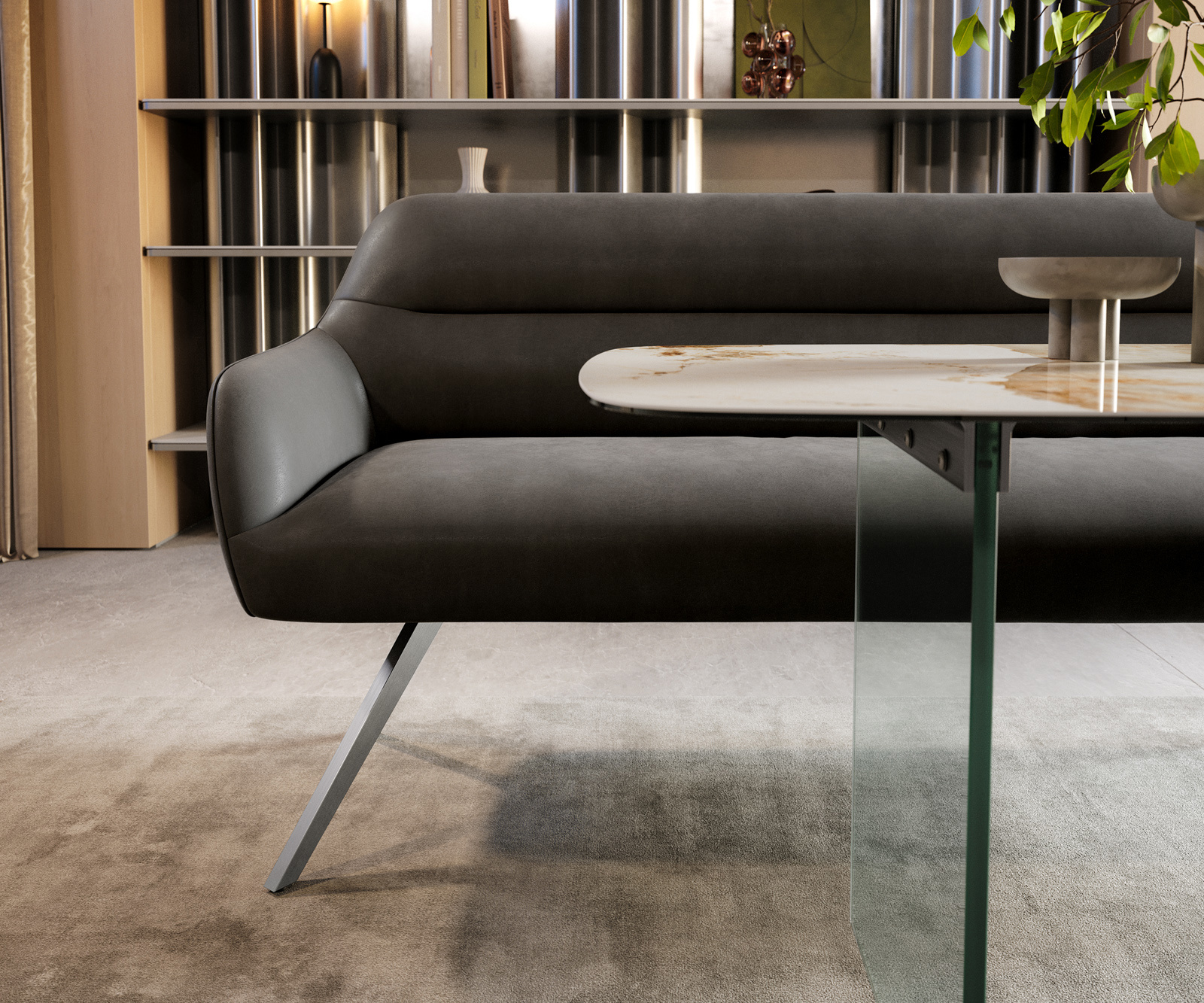 Jídelní lavice Taya spojuje lehkost a moderní eleganci. Jemné lemování a jemně zakřivený tvar podtrhují filigránovou linii. Uvnitř zajišťuje vysoce kvalitní sendvičová konstrukce z pěny (RG 40 kg/m³) v kombinaci s taštičkovými pružinami a vlnitou podložkou výjimečný komfort sezení a dlouhotrvající tvarovou stálost. Opěradlo a sedák jsou vyrobeny jako jeden souvislý čalouněný prvek, který lavici dodává klidný a kvalitní vzhled. Speciálně vyvinutá kovová podnož nabízí mimořádnou stabilitu a nevyžaduje žádné viditelné podpěry – inovativní řešení, které spojuje volně zavěšený design s spolehlivou stabilitou.