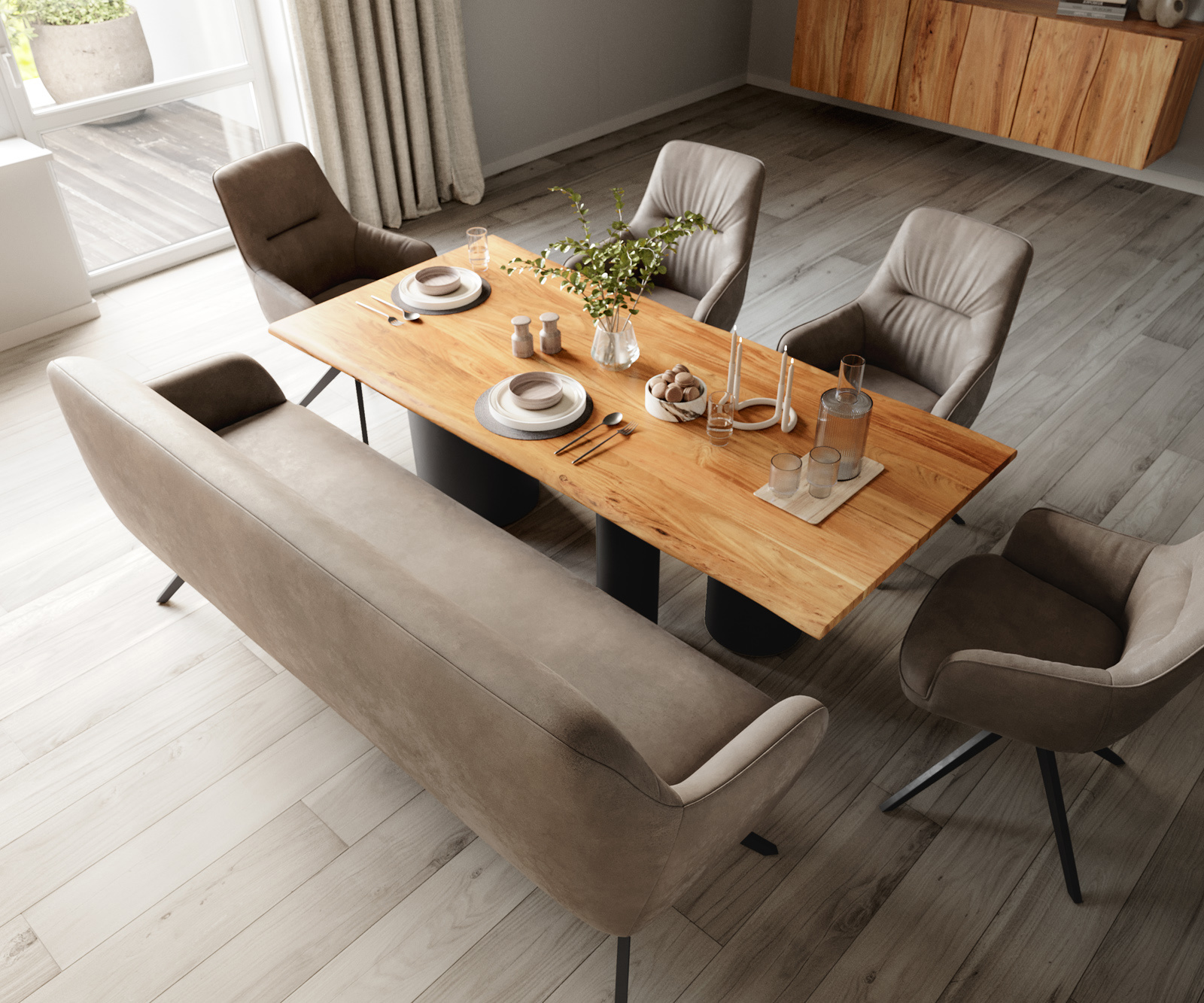 Naše židle Flex a stoly Edge dokonale navazují na design lavice: tvary, linie a podnože spolu harmonicky ladí. Stoly Edge o délce 2 metry tuto lavici ideálně doplňují. K tomu doporučujeme židle Flex Yago, Zoa, Pejo, Heira nebo Xana, které si můžete na přání vybrat ve stejném potahu. Tak vznikne jídelní prostor, který ukazuje smysl pro styl – dokonale sladěný a plný charakteru.