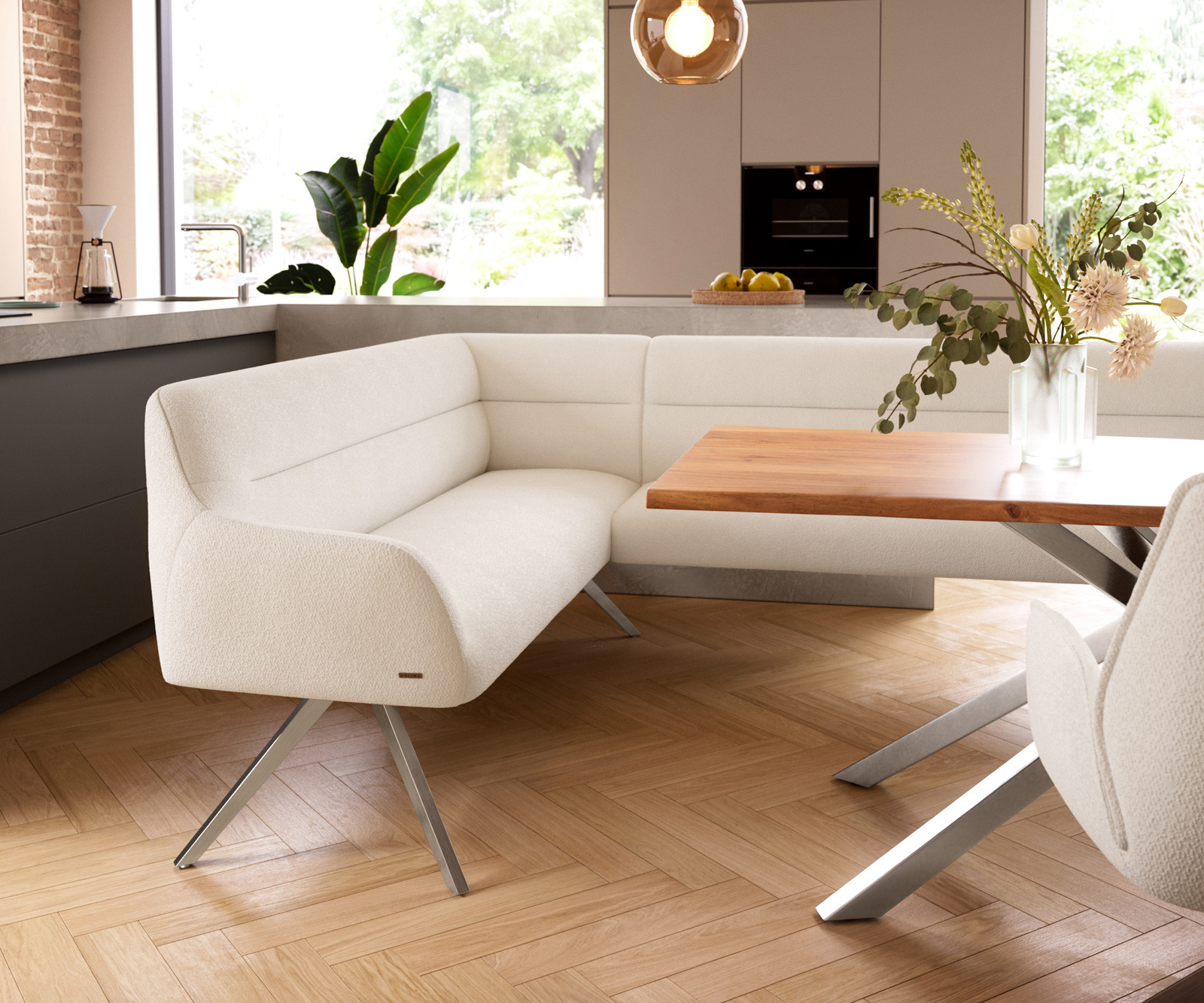 Jídelní lavice Taya-Flex 285×190 cm bouclé krémová bílá křížová podnož hranatá nerezová ocel taštičkové pružiny pravá