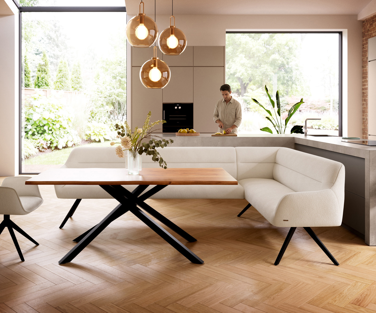 Jako součást našeho promyšleného systému lze rohovou lavici Taya ideálně kombinovat s našimi jídelními židlemi Flex a jídelními stoly Edge. Tvary, linie a podnože spolu dokonale ladí a vytvářejí harmonický celek v jídelně. Pro toto rohové řešení jsou obzvláště vhodné jídelní stoly Edge o délce 2 metry. K tomu doporučujeme jídelní židle Flex Yago, Zoa, Pejo, Heira nebo Xana, které si můžete na přání vybrat ve stejném potahu. Tak vznikne jídelní prostor, který ukazuje smysl pro styl – dokonale sladěný a plný charakteru.