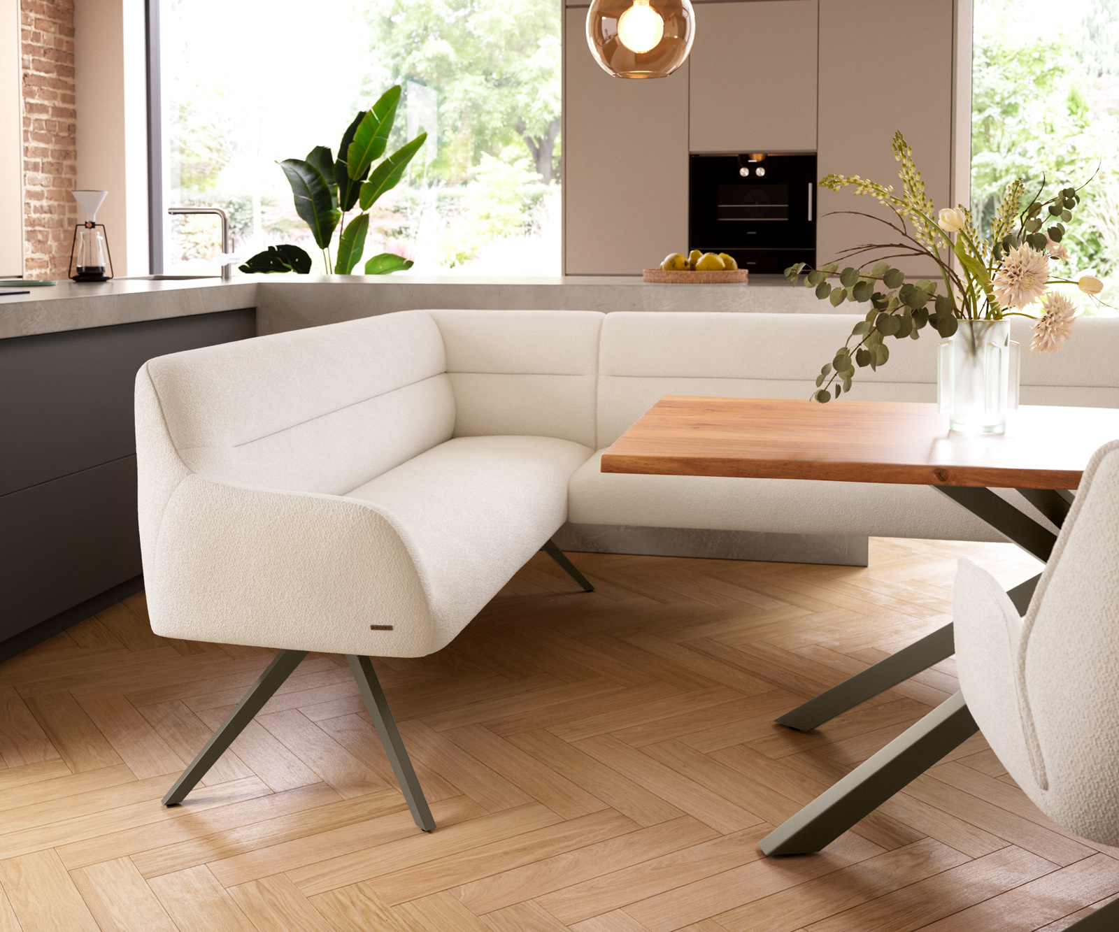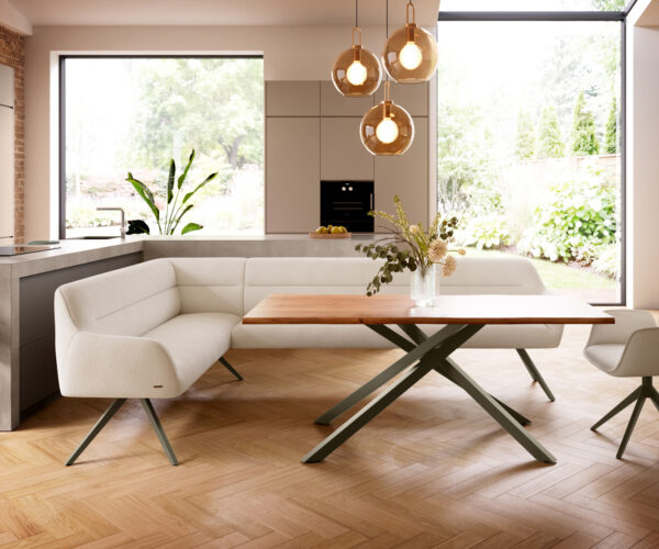 Jako součást našeho promyšleného systému lze rohovou lavici Taya ideálně kombinovat s našimi jídelními židlemi Flex a jídelními stoly Edge. Tvary, linie a podnože spolu dokonale ladí a vytvářejí harmonický celek v jídelním prostoru. Pro toto rohové řešení jsou obzvlášť vhodné jídelní stoly Edge o délce 2 metry. K tomu doporučujeme jídelní židle Flex Yago, Zoa, Pejo, Heira nebo Xana, které si můžete na přání vybrat ve stejném potahu. Tak vznikne jídelní kout, který vyjadřuje smysl pro styl – dokonale sladěný a plný charakteru.