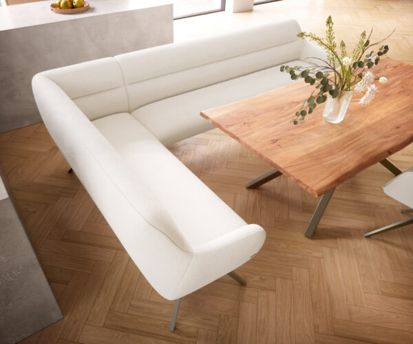 Jídelní lavice Taya-Flex 285×190 cm bouclé krémovo-bílá křížová podnož hranatá titanová barva taštičkové pružiny pravá