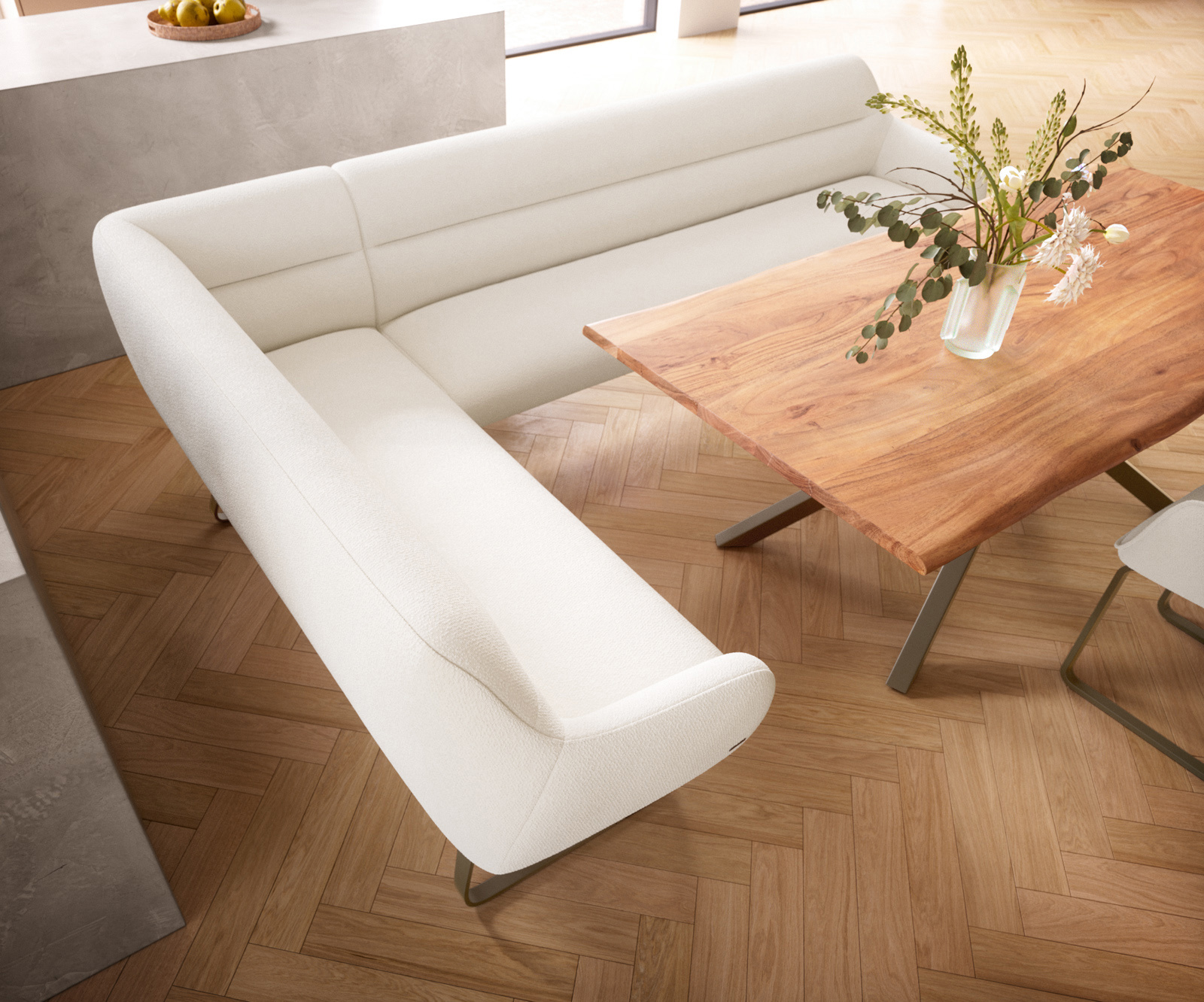 Jídelní lavice Taya-Flex 285×190 cm bouclé krémovo-bílá tenká podnož plochá titanová barva taštičkové pružiny pravá