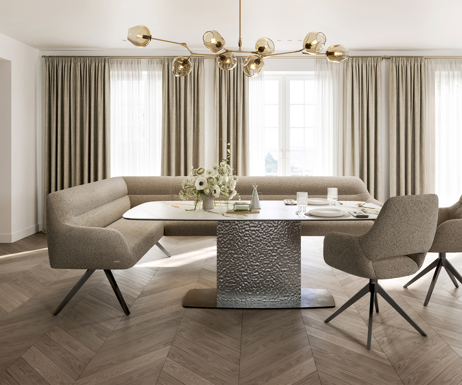 Ušlechtilá látka bouclé v jemném tmavě béžovém odstínu zaujme svou výraznou strukturou a měkkým povrchem. Díky harmonickému barevnému provedení se materiál snadno začlení do různých bytových konceptů a podtrhuje moderní a útulný charakter lavicového systému.