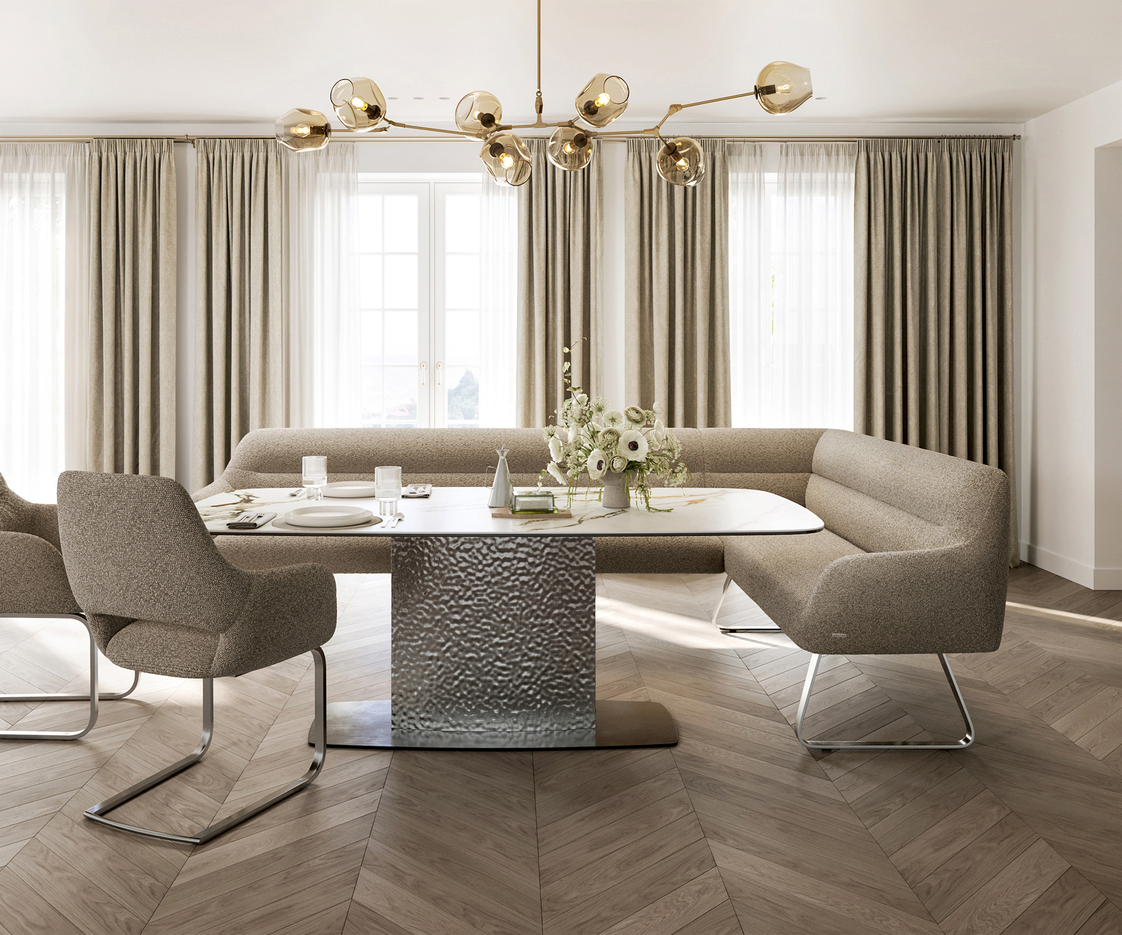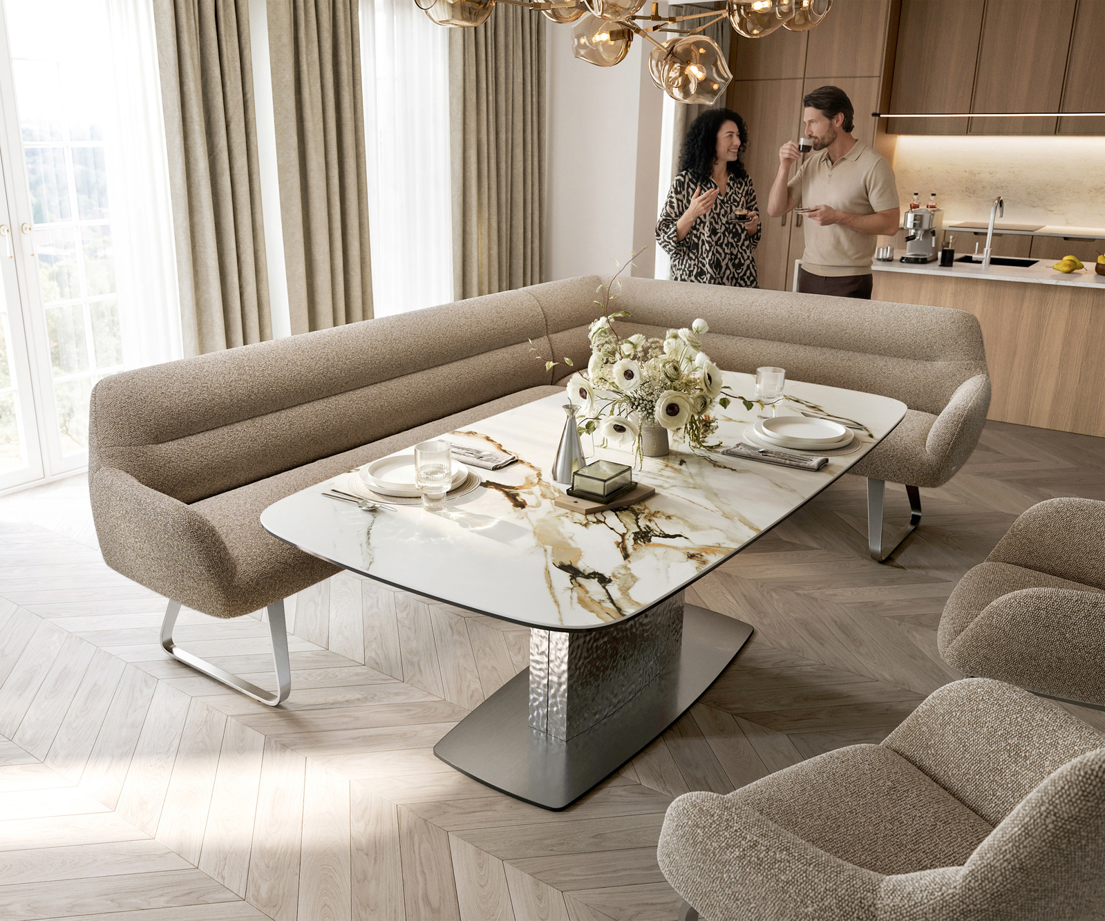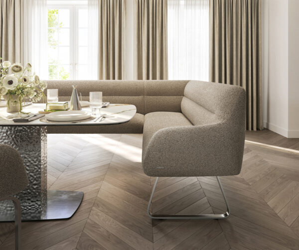 Jídelní lavice Taya-Flex 285×190 cm bouclé tmavě béžová tenká podnož nerezová ocel taštičkové pružiny levá