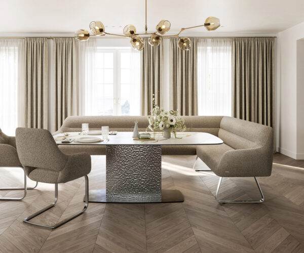 Jako součást našeho promyšleného systému lze rohovou lavici Taya ideálně kombinovat s našimi jídelními židlemi Flex a jídelními stoly Edge. Tvary, linie a rámy spolu dokonale ladí a vytvářejí harmonický celek v jídelním prostoru. Pro toto rohové řešení jsou obzvlášť vhodné jídelní stoly Edge o délce 2 metry. K tomu doporučujeme židle Flex Yago, Zoa, Pejo, Heira nebo Xana, které si můžete na přání vybrat ve stejném potahu. Tak vznikne jídelní prostor, který ukazuje smysl pro styl – dokonale sladěný a plný charakteru.