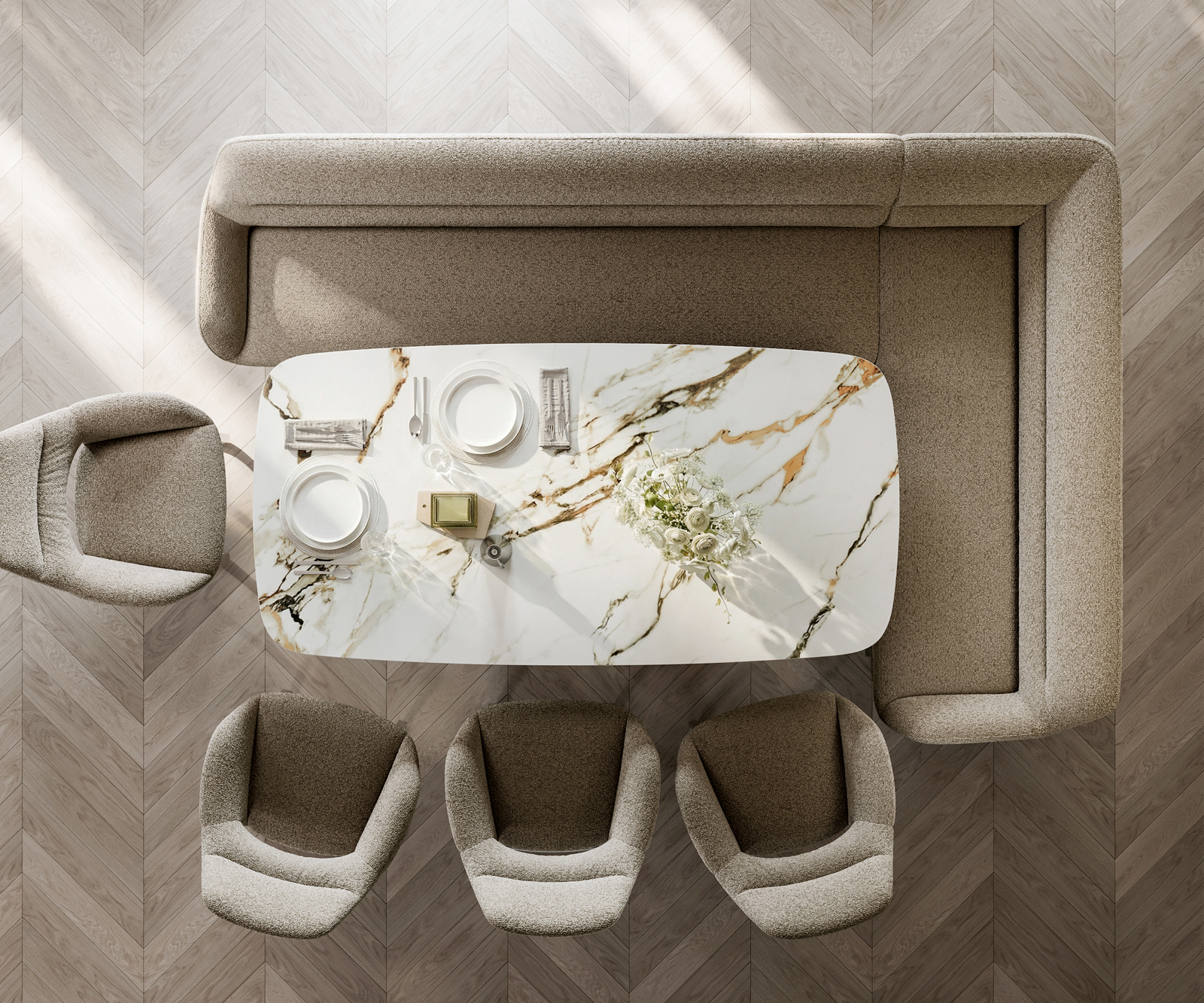 Luxusní bouclé látka v jemném tmavě béžovém odstínu zaujme svou výraznou strukturou a měkkým povrchem. Díky harmonickému barevnému ladění se materiál snadno začlení do různých interiérových konceptů a podtrhuje moderní a útulný charakter lavicového systému.