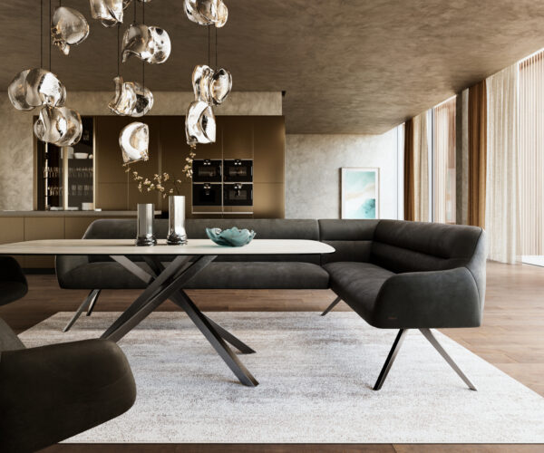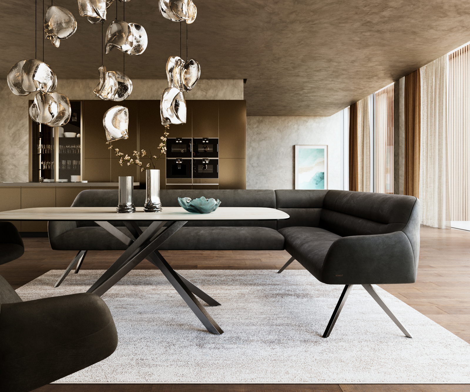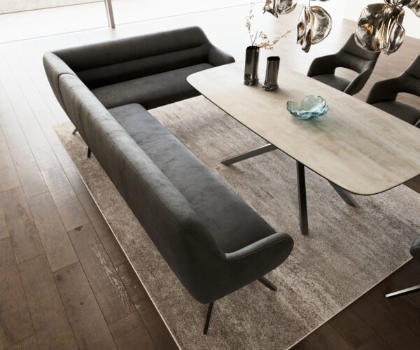 Jako součást našeho promyšleného systému lze rohovou lavici Taya ideálně kombinovat s našimi jídelními židlemi Flex a jídelními stoly Edge. Tvary, linie a podnože spolu dokonale ladí a vytvářejí harmonický celek v jídelně. Pro toto rohové řešení jsou obzvlášť vhodné jídelní stoly Edge o délce 2 metry. K tomu doporučujeme jídelní židle Flex Yago, Zoa, Pejo, Heira nebo Xana, které si můžete na přání vybrat ve stejném potahu. Tak vznikne jídelní prostor, který vyjadřuje smysl pro styl – dokonale sladěný a plný charakteru.