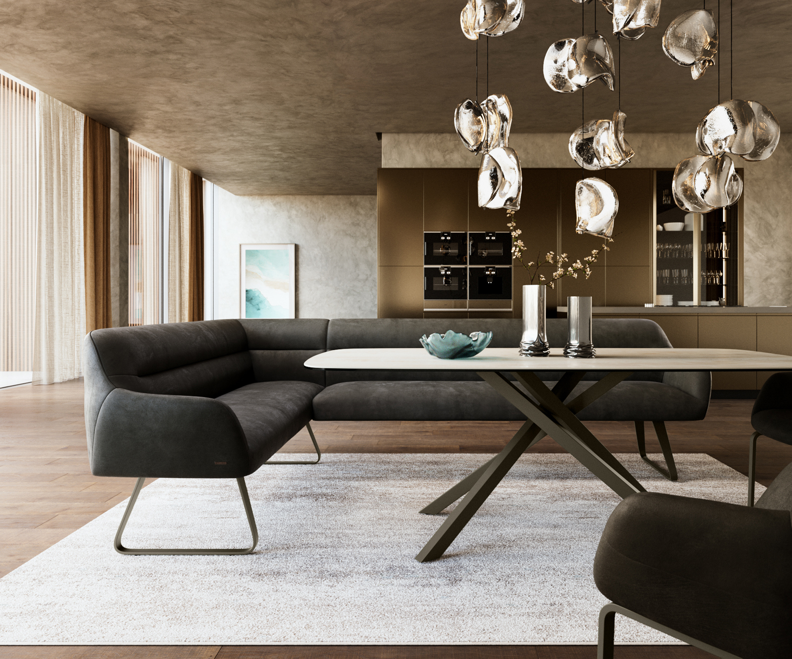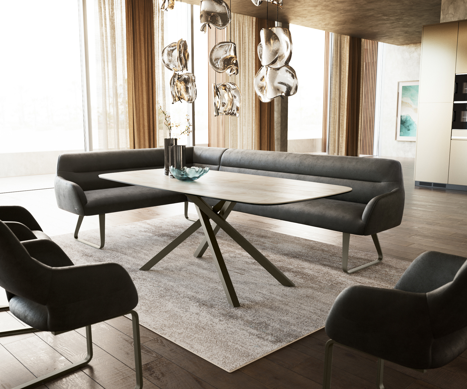 Nízká tenká podnož dodává jídelní lavici moderní a lehký vzhled. Šikmé, decentně zaoblené linie zajišťují elegantní a otevřenou siluetu. Díky souvislému tvaru vzniká harmonická rovnováha mezi stabilitou a designem.