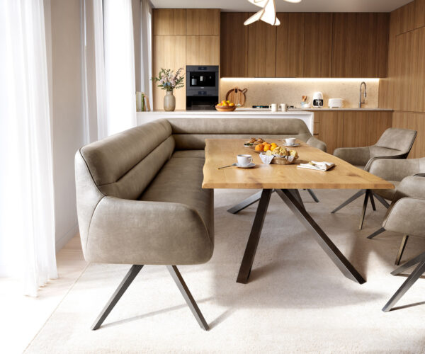 Jako součást našeho promyšleného systému se rohová lavice Taya ideálně kombinuje s našimi jídelními židlemi Flex a jídelními stoly Edge. Tvary, linie a podnože dokonale ladí a vytvářejí harmonický celek v jídelně. Pro toto rohové řešení jsou zvláště vhodné jídelní stoly Edge o délce 2 metry. K tomu doporučujeme jídelní židle Flex Yago, Zoa, Pejo, Heira nebo Xana, které lze na přání zvolit ve stejném potahu. Tak vznikne jídelní prostor, který ukazuje smysl pro styl – dokonale sladěný a plný charakteru.