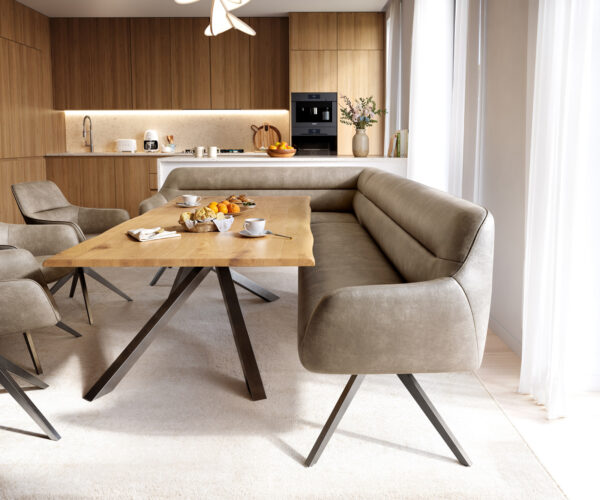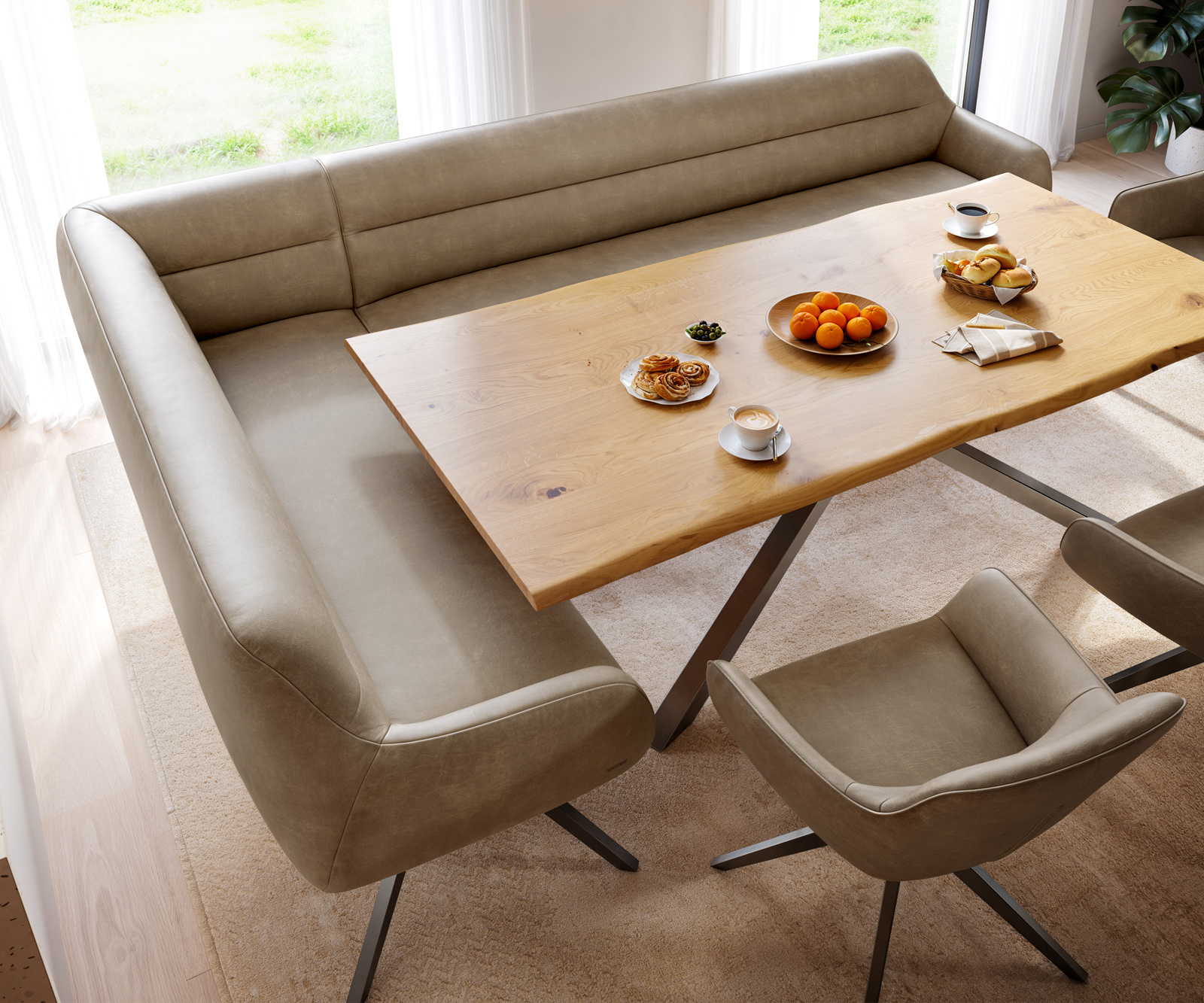 Jako součást našeho promyšleného systému se rohová lavice Taya ideálně kombinuje s našimi jídelními židlemi Flex a jídelními stoly Edge. Tvary, linie a podnože dokonale ladí a vytvářejí harmonický celek v jídelně. Pro toto rohové řešení jsou zvláště vhodné jídelní stoly Edge o délce 2 metry. K tomu doporučujeme jídelní židle Flex Yago, Zoa, Pejo, Heira nebo Xana, které lze na přání zvolit ve stejném potahu. Tak vznikne jídelní prostor, který ukazuje smysl pro styl – dokonale sladěný a plný charakteru.