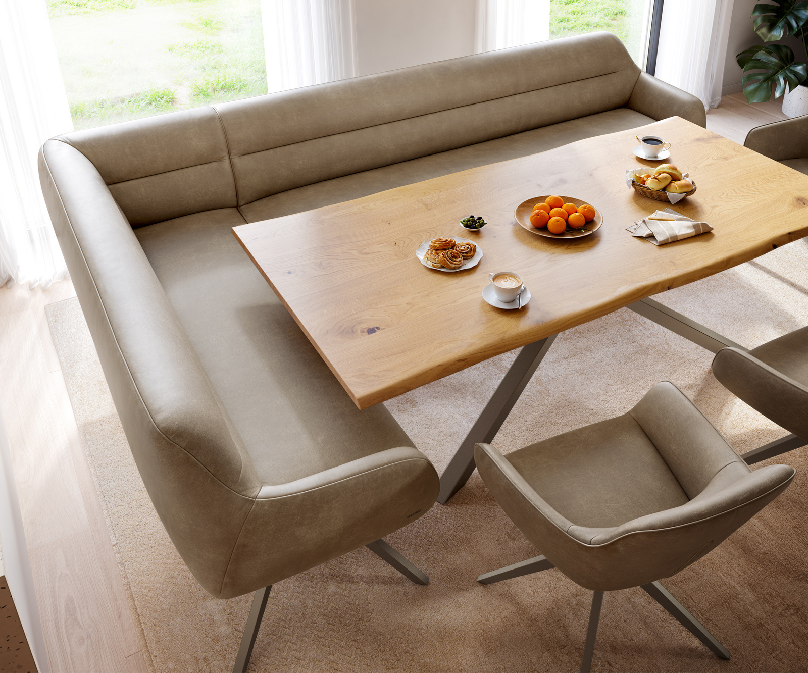 Jako součást našeho promyšleného systému lze rohovou lavici Taya ideálně kombinovat s našimi jídelními židlemi Flex a jídelními stoly Edge. Tvary, linie a podnože spolu dokonale ladí a vytvářejí harmonický celek v jídelně. Pro toto rohové řešení jsou obzvlášť vhodné jídelní stoly Edge o délce 2 metry. K tomu doporučujeme židle Flex Yago, Zoa, Pejo, Heira nebo Xana, které si můžete na přání vybrat v identickém potahu. Tak vznikne jídelní prostor, který ukazuje smysl pro styl – dokonale sladěný a plný charakteru.