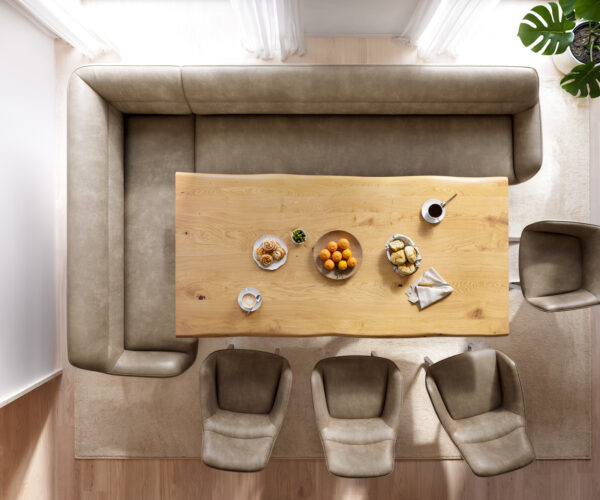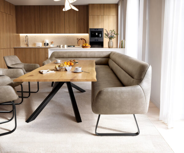 Jako součást našeho promyšleného systému lze rohovou lavici Taya ideálně kombinovat s našimi jídelními židlemi Flex a jídelními stoly Edge. Tvary, linie a podstavce spolu dokonale ladí a vytvářejí harmonický celek v jídelně. Pro toto rohové řešení jsou obzvlášť vhodné jídelní stoly Edge o délce 2 metry. K tomu doporučujeme jídelní židle Flex Yago, Zoa, Pejo, Heira nebo Xana, které lze na přání zvolit ve stejném potahu. Tak vznikne jídelní prostor, který ukazuje smysl pro styl – dokonale sladěný a plný charakteru.