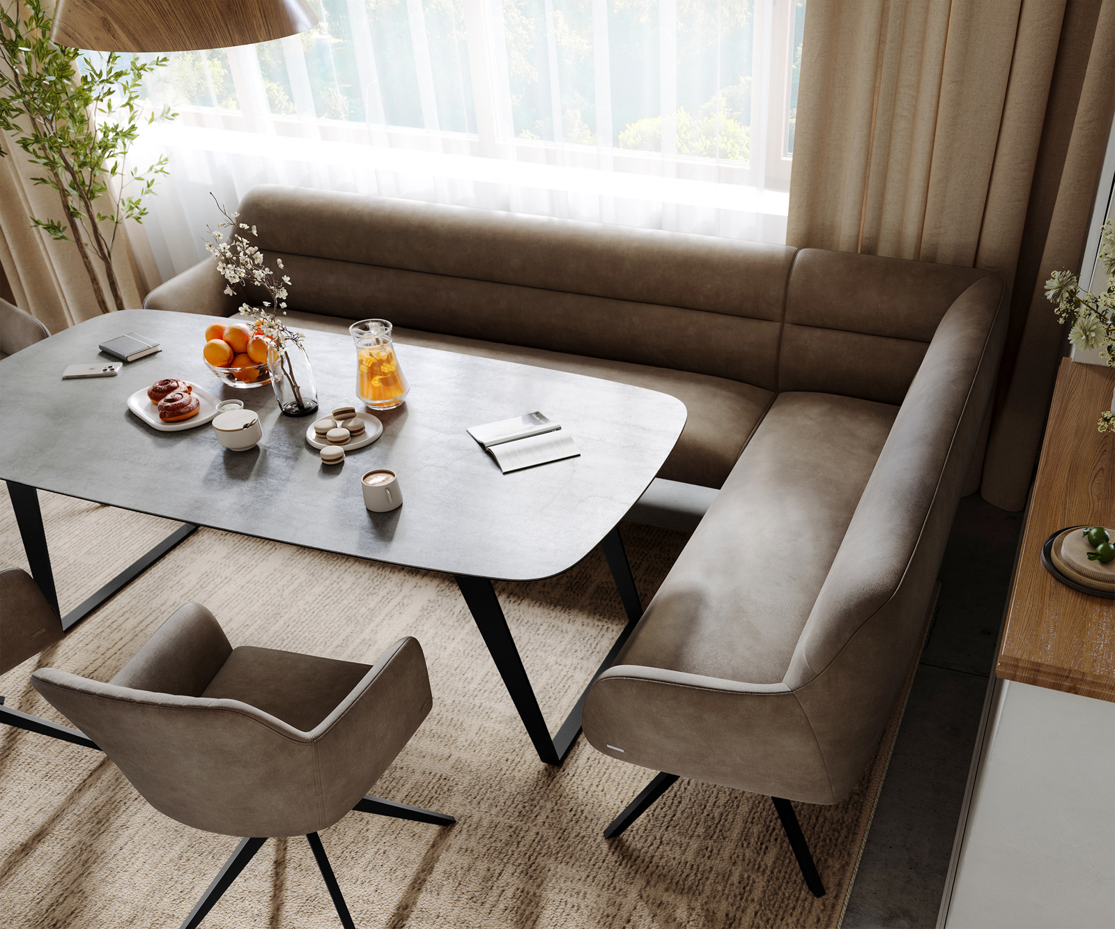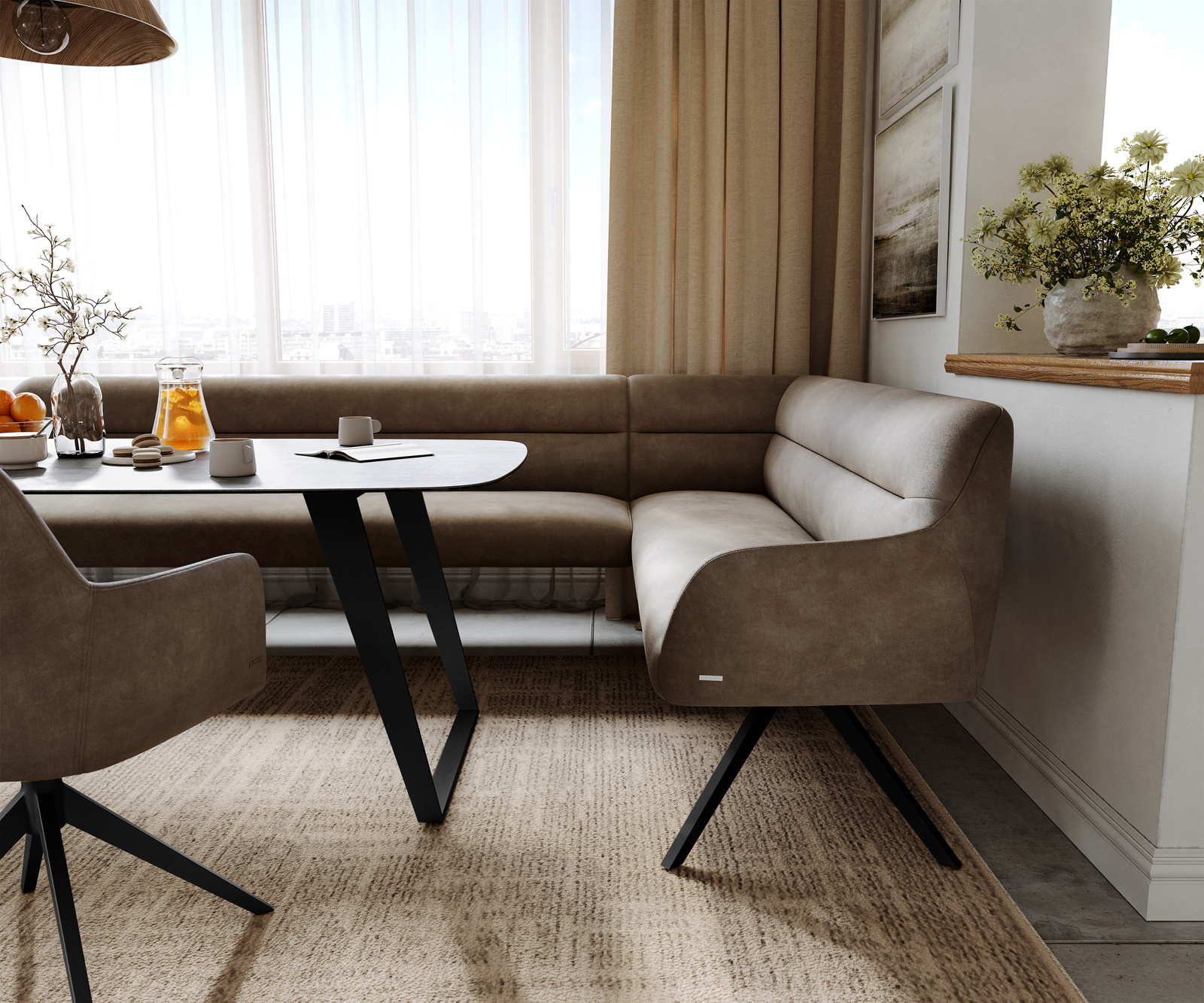 Jako součást našeho promyšleného systému lze rohovou lavici Taya ideálně kombinovat s našimi jídelními židlemi Flex a jídelními stoly Edge. Tvary, linie a podnože spolu dokonale ladí a vytvářejí harmonický celek v jídelně. Pro toto rohové řešení jsou obzvlášť vhodné jídelní stoly Edge o délce 2 metry. K tomu doporučujeme jídelní židle Flex Yago, Zoa, Pejo, Heira nebo Xana, které si můžete na přání vybrat ve stejném potahu. Tak vznikne jídelní prostor, který vyjadřuje smysl pro styl – dokonale sladěný a plný charakteru.