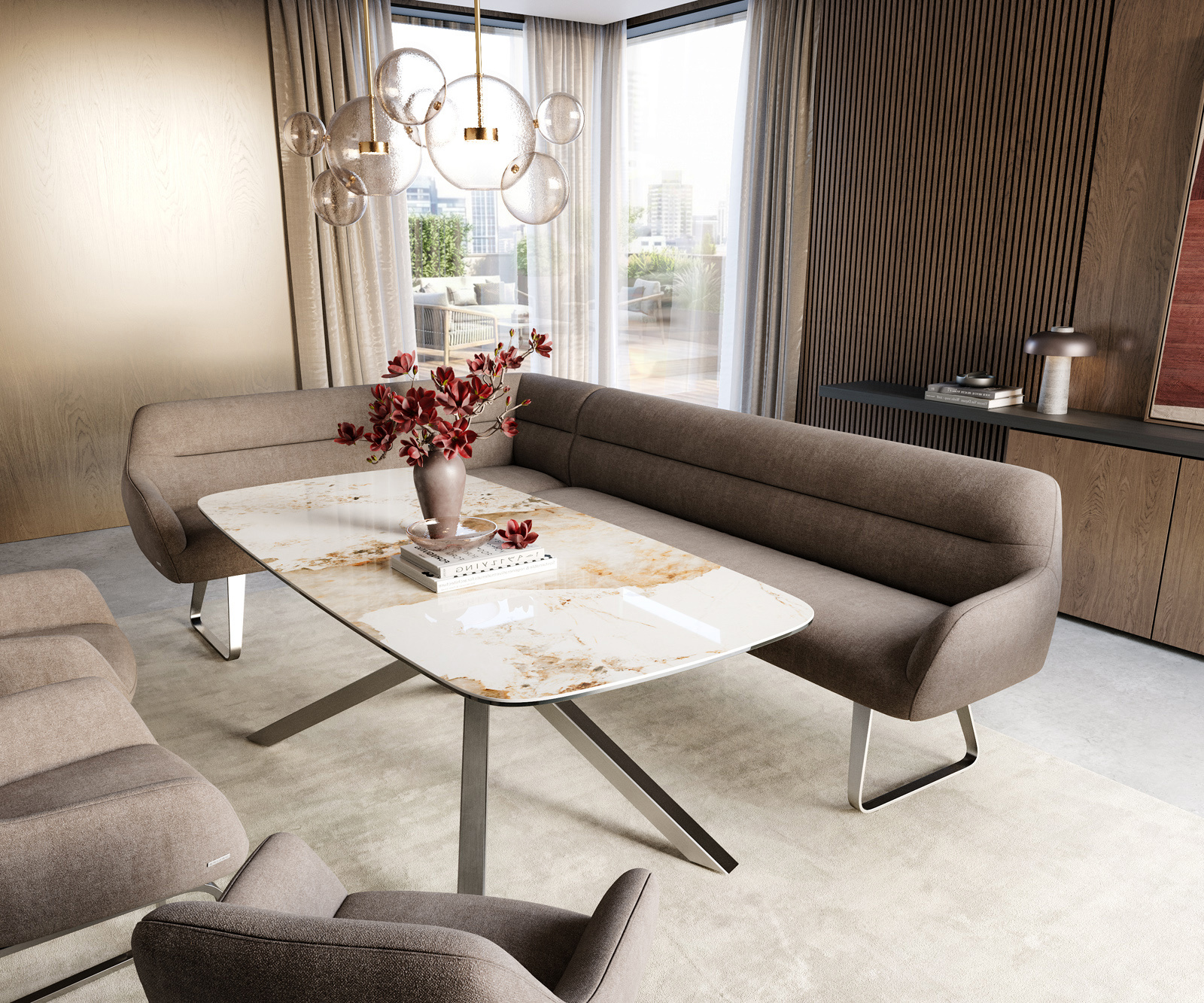 Plochý rám na tenkých nohách dodává jídelní lavici moderní a lehký vzhled. Šikmé, decentně zaoblené linie zajišťují elegantní, otevřenou siluetu. Díky souvislému tvaru vzniká harmonická rovnováha mezi stabilitou a designem.