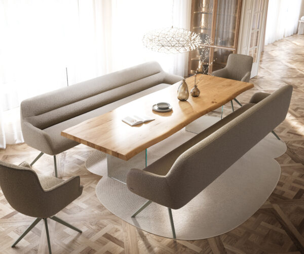 Naše jídelní židle Flex a jídelní stoly Edge dokonale navazují na design lavice: tvary, linie a podnože spolu harmonicky ladí. Jídelní stoly Edge o délce 3 metry jsou na to optimálně přizpůsobené. K tomu doporučujeme jídelní židle Flex Yago, Zoa, Pejo, Heira nebo Xana, které si můžete na přání vybrat ve stejném potahu. Tak vznikne jídelní prostor, který ukazuje smysl pro styl – dokonale sladěný a plný charakteru.