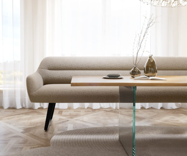 Nízká tenká podnož dodává jídelní lavici moderní a lehký vzhled. Šikmé, decentně zaoblené linie vytvářejí elegantní a otevřenou siluetu. Díky souvislému tvaru vzniká harmonická rovnováha mezi stabilitou a designem.