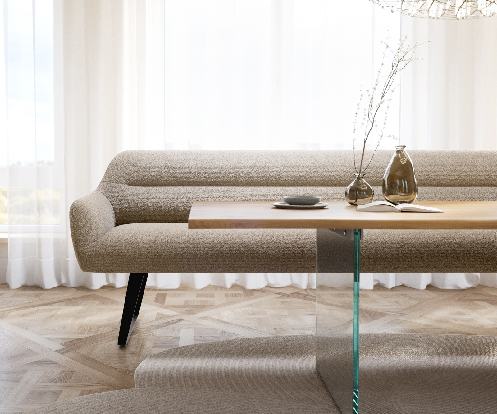 Jídelní lavice Taya-Flex 300 cm bouclé tmavě béžová tenká podnož plochá černá taštičkové pružiny
