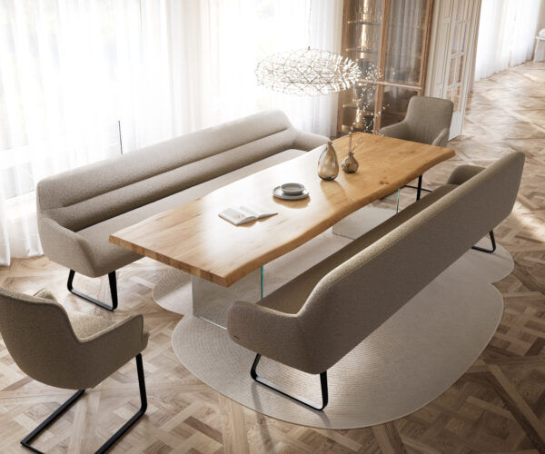 Naše jídelní židle Flex a jídelní stoly Edge dokonale navazují na design lavice: tvary, linie a podnože spolu perfektně ladí. Jídelní stoly Edge o délce 3 metry jsou na to optimálně přizpůsobeny. K tomu doporučujeme jídelní židle Flex Yago, Zoa, Pejo, Heira nebo Xana, které si můžete na přání vybrat ve stejném potahu. Tak vznikne jídelní prostor, který ukazuje smysl pro styl – perfektně sladěný a plný charakteru.
