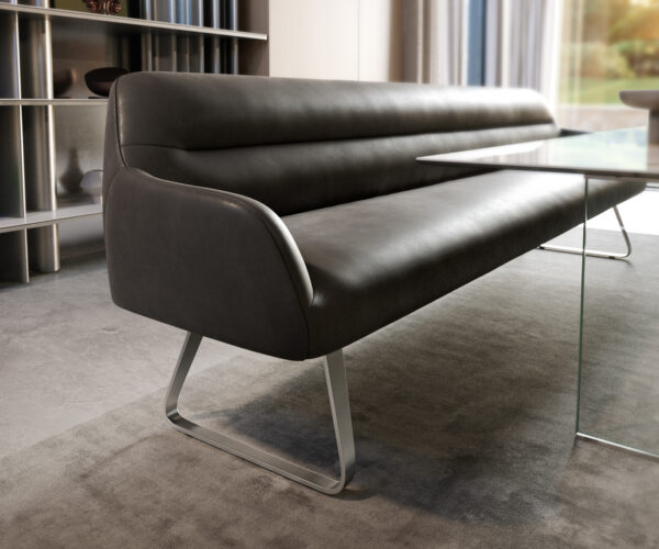 Nízká podnož ve tvaru lyžiny dodává jídelní lavici moderní, lehký vzhled. Šikmé, decentně zaoblené linie vytvářejí elegantní, otevřenou siluetu. Díky souvislému tvaru vzniká harmonická rovnováha mezi stabilitou a designem.