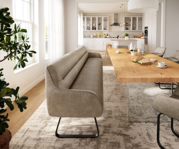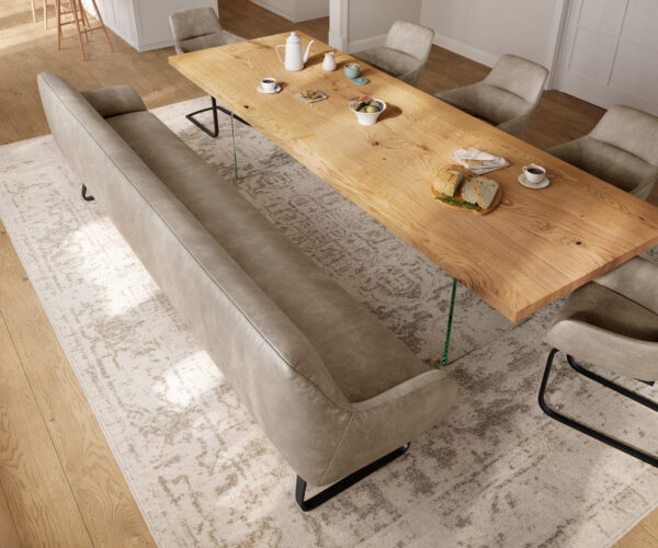 Nízká tenká podnož dodává jídelní lavici moderní a lehký vzhled. Šikmo vedené, decentně zaoblené linie vytvářejí elegantní a otevřenou siluetu. Díky souvislému tvaru vzniká harmonická rovnováha mezi stabilitou a designem.