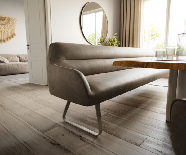 Nízká podnož ve tvaru lyžiny dodává jídelní lavici moderní a lehký vzhled. Šikmo vedené, decentně zaoblené linie vytvářejí elegantní a otevřenou siluetu. Díky souvislému tvaru vzniká harmonická rovnováha mezi stabilitou a designem.