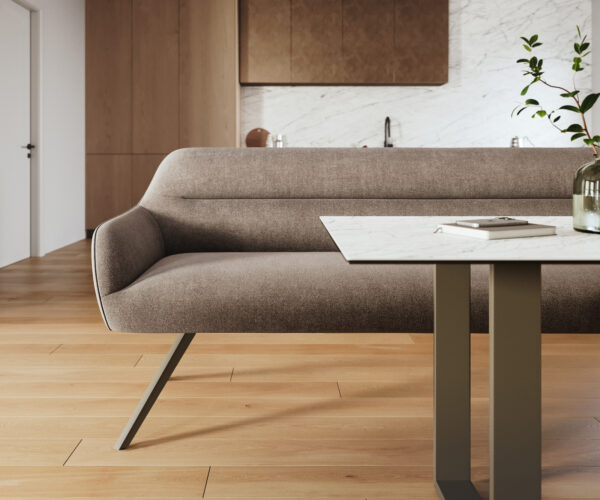 Jídelní lavice Taya zaujme jemným tvarem a precizně zpracovaným lemováním, které zdůrazňuje jemně zakřivené linie. Uvnitř zajišťuje vysoce kvalitní sendvičová konstrukce z pěny (RG 40 kg/m³) v kombinaci s taštičkovými pružinami a vlnitou podložkou výjimečný komfort sezení a dlouhotrvající tvarovou stálost. Opěradlo a sedák jsou vyrobeny jako jeden celek čalounění, což lavici dodává klidný a kvalitní vzhled. Speciálně vyvinutý kovový rám nabízí mimořádnou stabilitu a nevyžaduje žádné viditelné podpěry – inovativní řešení, které spojuje volně zavěšený design s spolehlivou stabilitou.