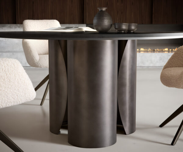 Kombinace hluboké černé se stříbrnou a kovu v barvě Black Antique dodává Adenza nadčasový a moderní lesk. Leštěná mramorová deska působí jako klidné jezero, zatímco její stříbrné žíhání vytváří jemně třpytivou hloubku. Stůl, který vytváří architekturu prostoru a doprovází každou příležitost se stylem.