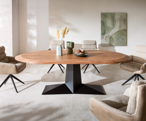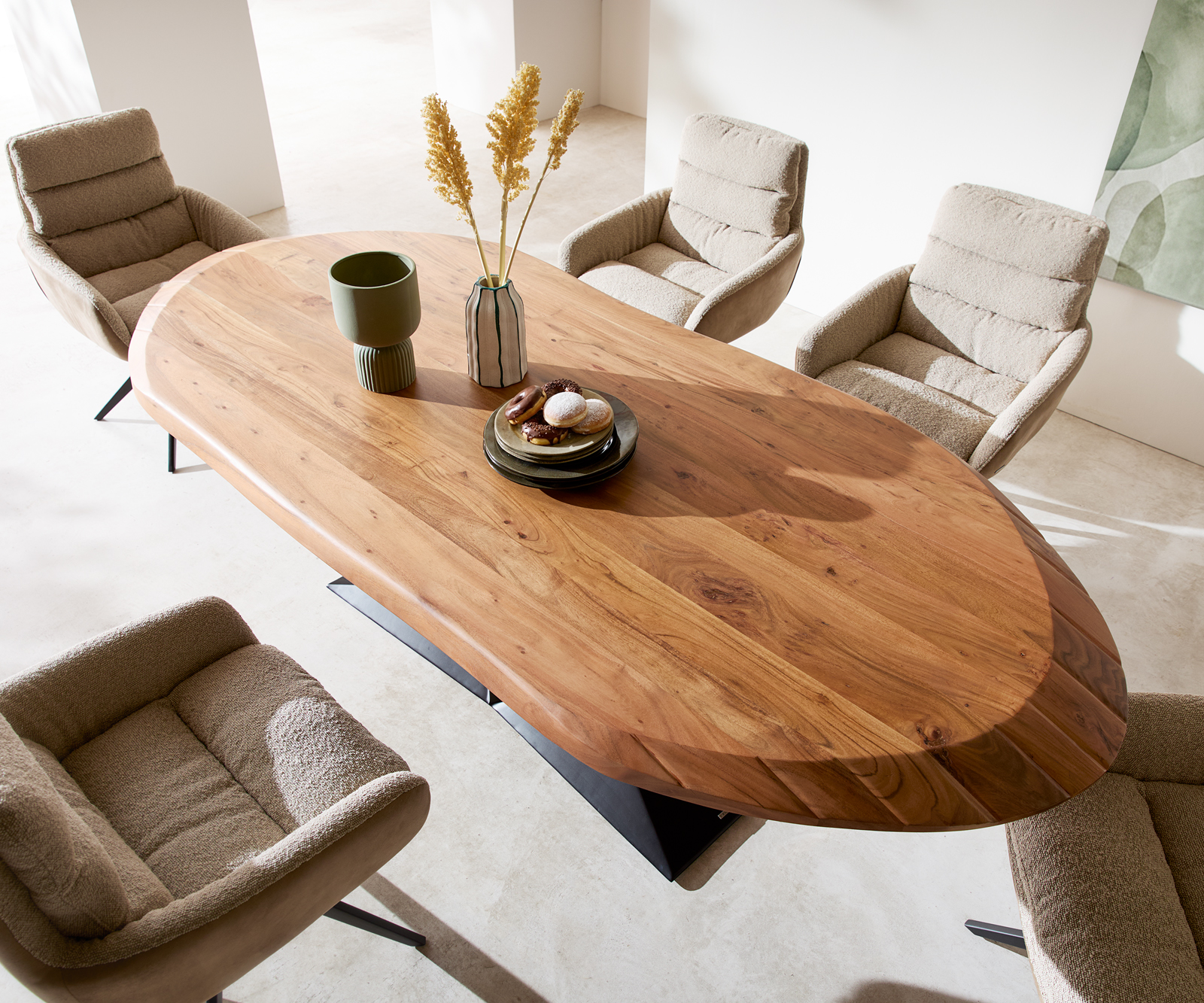Jeho vysokou kvalitu poznáte na jídelním stole Aithon na první pohled. Pečlivé zpracování vybraných materiálů dodává tomuto atraktivně navrženému kusu nábytku stylové charisma, které elegantně obohacuje jídelní prostor. Jako moderní designový prvek se ukazuje výrazný tvar s elegantní oválnou deskou stolu z masivního dřeva a robustní středovou nohou z práškově lakovaného kovu.