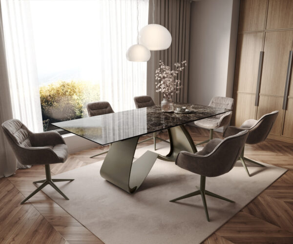 - Deska stolu je vyrobena z jednoho celistvého keramického kusu a získává svou jedinečnost v harmonickém celkovém vzhledu i při rozkládací funkci bez přerušení nebo viditelných spár.