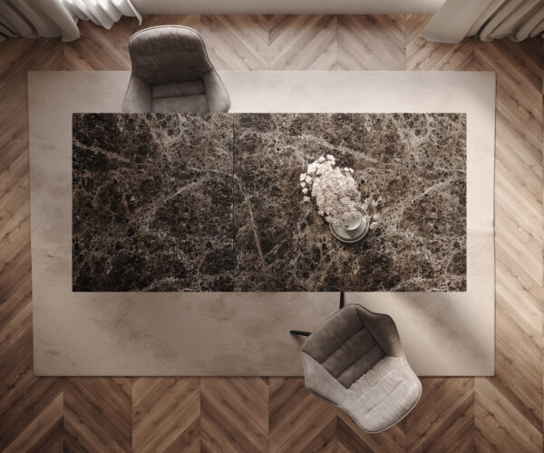 Při designu jídelního stolu Edge Emperador Extra z pravé italské keramické desky Laminam® je v popředí jedinečná krása a nádhera mramoru. Elegantní hnědé odstíny a jedinečná kresba, které dělají mramor tak oblíbeným, byly s pomocí nejmodernější technologie a působivé řemeslné práce přeneseny na vysoce kvalitní keramiku a září bezchybným leskem. Díky překvapivému scénickému efektu a propracovanému vysokolesklému leštění působí deska stolu obzvlášť autenticky. Každý prvek a i ta nejmenší žilka u Edge vystupuje jako pod lupou detailně na povrch a dodávají stolu jedinečnou hloubku a komplexnost. Mistrovsky vyrobená z jednoho kusu keramiky, obdélníková deska stolu bez spár nebo přerušení barevných přechodů vyvolává téměř mystický dojem, který tě každý den okouzlí.
