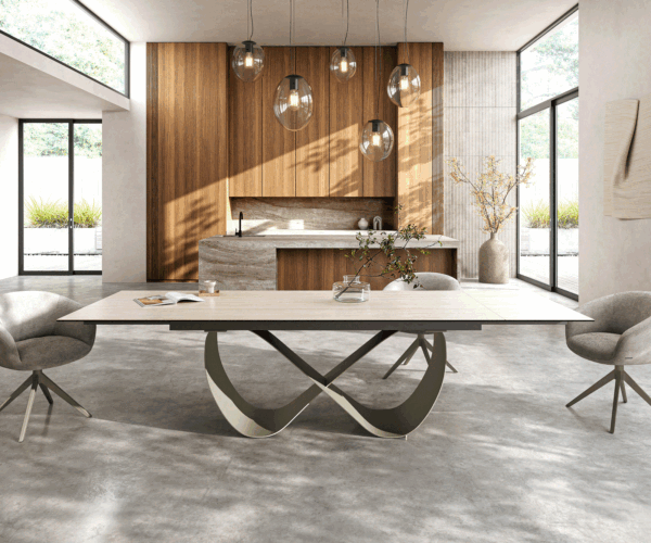 Také jedinečný podnož tvého rozkládacího stolu je skutečným designovým vrcholem. Inspirována křídly motýla a symbolem nekonečna podnož vyjadřuje hluboké porozumění nadčasové eleganci. Podnož byla pečlivě ošetřena cennými pigmenty, které nechávají kov vynikat v působivém titanovém efektu a dokonale doplňují design.