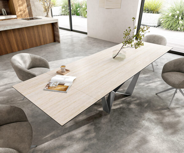S elegantním efektem přírodního kamene – jídelní stůl Edge Travertino Bianco