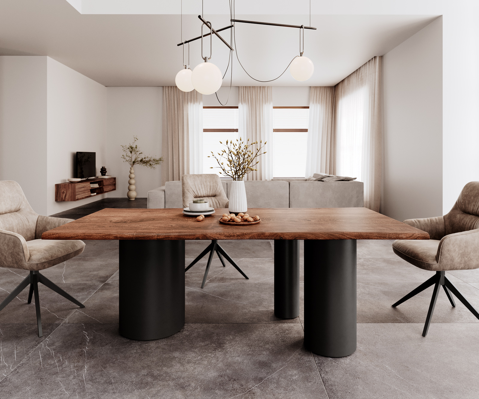 Elegantní podnož z práškově lakovaného kovu v nadčasové černé barvě zdůrazňuje výjimečný vzhled desky stolu. Válcové nohy ve třech různých průměrech jsou inspirovány vyvážeností a harmonií. Vytvářejí jedinečnou dynamiku a zároveň poskytují vašemu stolu pevnou a stabilní oporu.