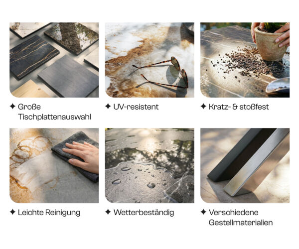 • Elegantní deska stolu z kvalitní keramiky, ideální pro venkovní použití
