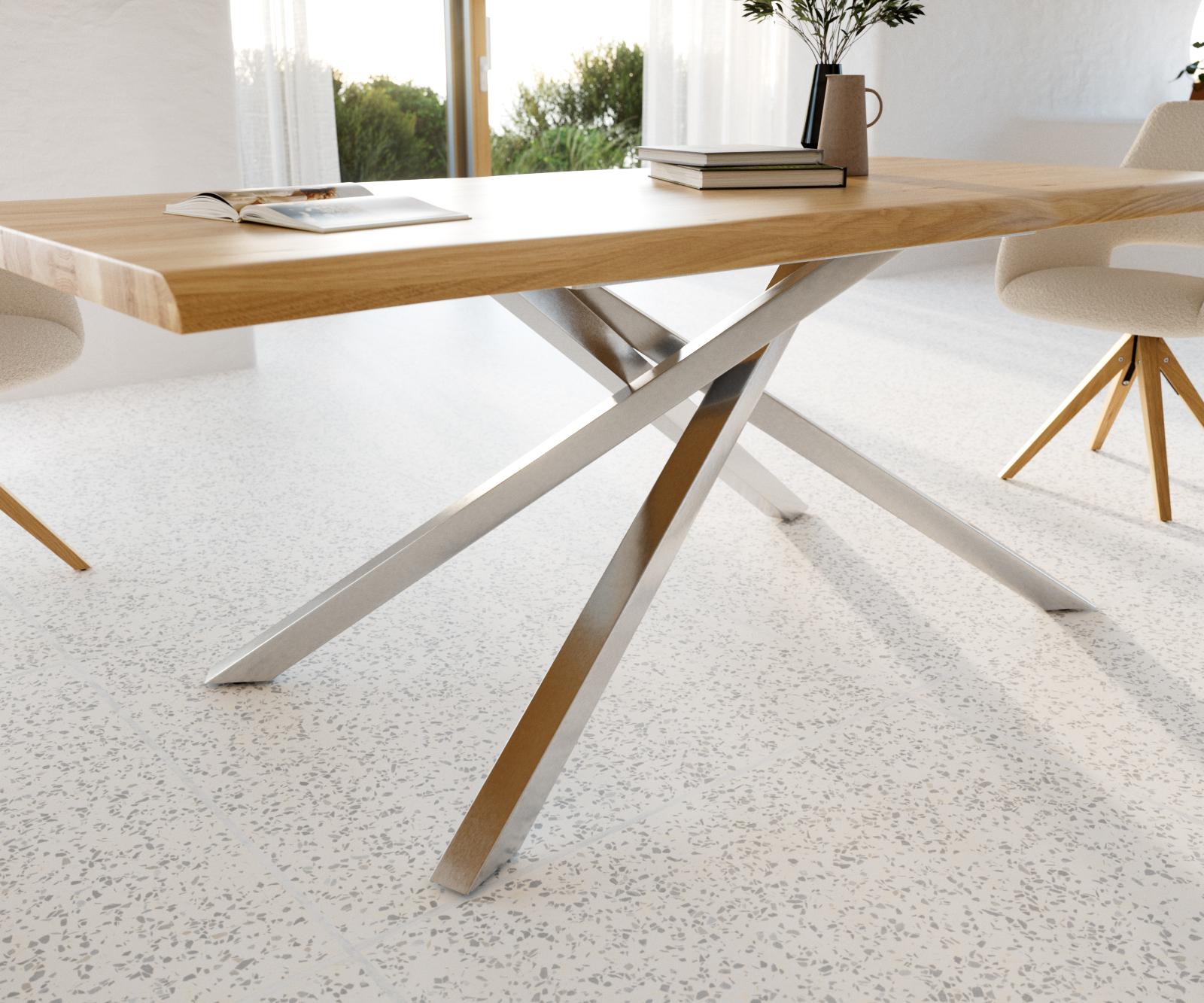 Díky elegantní křížové podnoži a obdélníkovým nohám působí váš stůl Edge obzvlášť stylově. Moderní akcenty dodává podnož použitím kvalitní nerezové oceli, která svým stříbrným leskem vytváří příjemnou atmosféru. Křížová podnož je precizně zpracovaná a vyznačuje se mimořádnou pevností a dlouhou životností.
