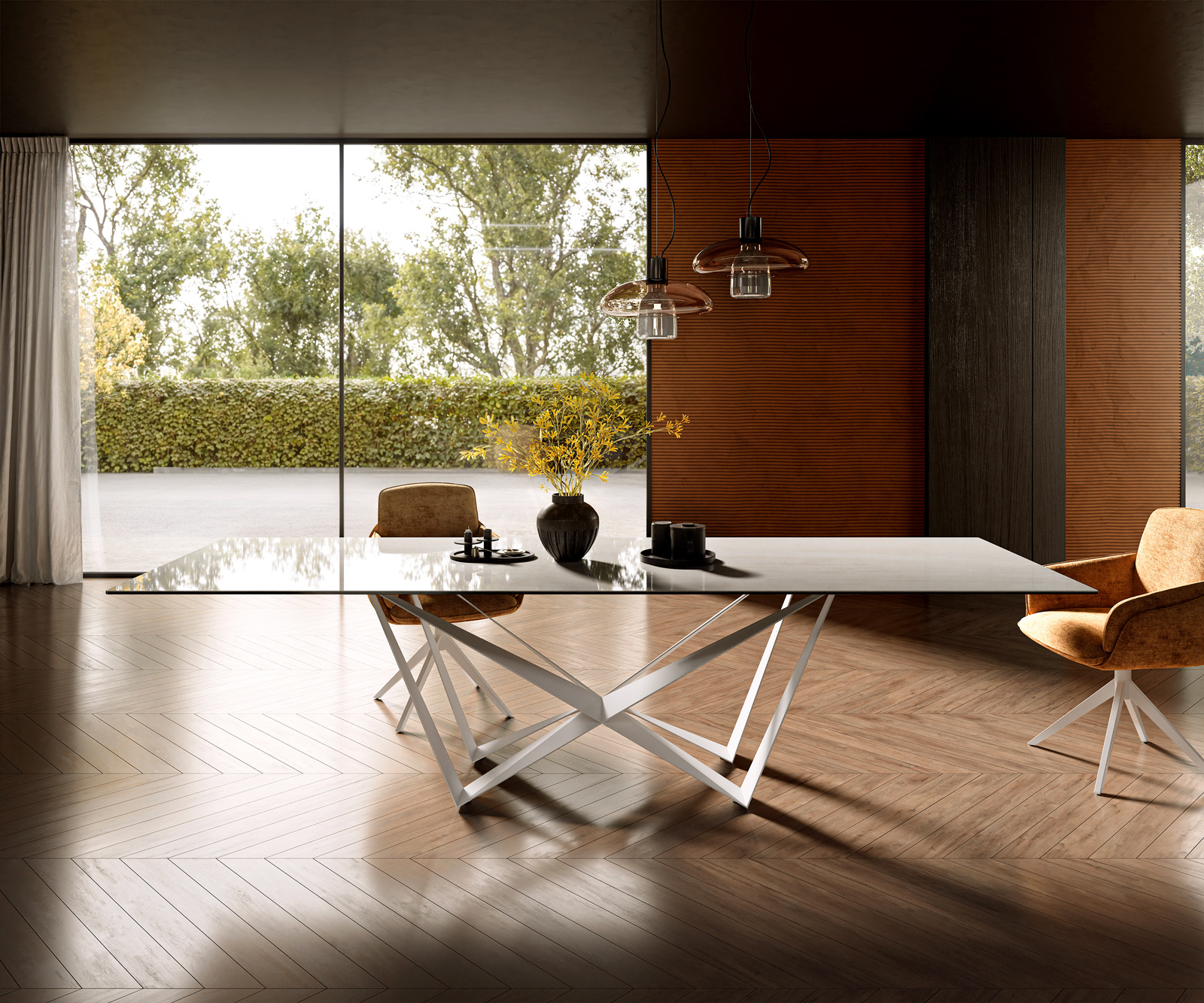 Jídelní stůl Edge 300×100 cm keramika onyx champagne spider kov bílá