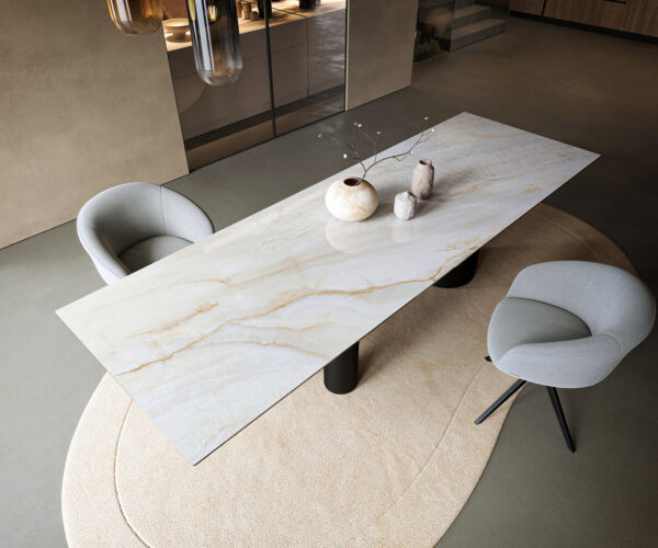 Jako tichý okamžik světla na kameni: jídelní stůl Edge v obdélníkovém tvaru působí současně jasně a prostorně. Díky leštěnému povrchu vzniká ušlechtilý lesk, který měkce zachycuje světlo a nechává ho klouzat přes krémovou, perlově šedou a teplé zlaté žíly. Inspirován půvabem pravého onyxu – přírodního kamene známého svou hlubokou, téměř zářící elegancí – získává stůl zvlášť luxusní charisma. Přímý tvar dodává designu vzdušnost, uspořádává prostor a proměňuje každou večeři v jeviště nadčasové estetiky.