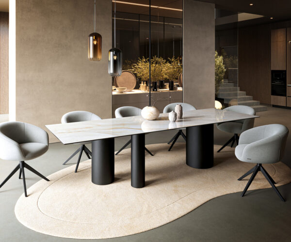 Elegantní podnož z práškově lakovaného kovu v nadčasové černé barvě zdůrazňuje výjimečný vzhled desky stolu. Cylindrické nohy ve třech různých průměrech jsou inspirovány vyvážeností a rovnováhou. Vytvářejí jedinečnou dynamiku a zároveň poskytují tvému stolu pevnou a stabilní oporu.